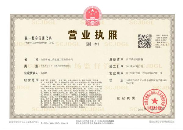 我公司山西华城大禹建设工程有限公司成立于二零一二年七月十二日,位于山西综改示范区太原学府园区电子路3号L座217室注册资本伍仟贰佰万圆整,经营范围主要是(建筑施工;建筑工程;地基与基础工程;建筑物拆除(不含爆破);建筑幕墙工程;防水防腐保温工程;建筑装饰装修工程;体育场地设施工程;土石方工程;钢结构工程;市政工程;古建筑工程;水利工程;电力工程;园林绿化工程;公路工程;城市轨道交通工程;港口航道工程;机场场道工程;环保工程;铁路工程;矿山工程;桥梁与隧道工程;石油化工工程;治金工程;电子与智能化工程;消防工程;机电设备安装工程;地质灾害治理工程;特种工程;城市道路照明工程;通信工程;输变电工程;模板脚手架工程;管道工程);河湖整治及水土保持;计算机信息系统集成;安全技术防范系统的设计、安装;可行性研究报告的编制;工程项目环境影响评估及技术咨询服务;特种设备(起重机械)的安装;荒山治理;建筑工程技术咨询;工程测量;测绘服务;建筑劳务分包;保洁服务;普通机槭设备的安装、租赁、销售;房屋租赁;物业管理;预拌混凝土、装饰材料、建筑材料、五金交电、生铁、钢材的销售;工程建设项目招标代理;工程造价咨询。